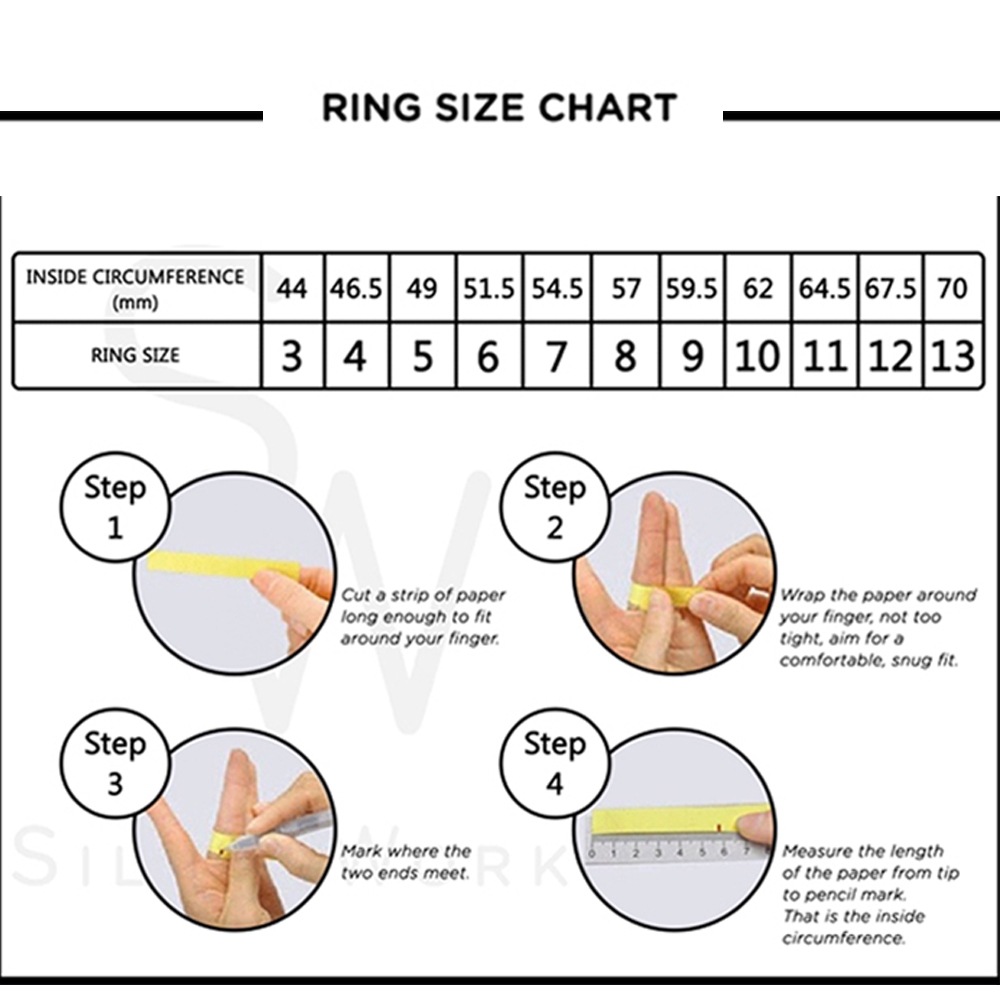 Instructions and tips for correctly measuring with or without a ring plus a sizing table and conversion ring size charts.